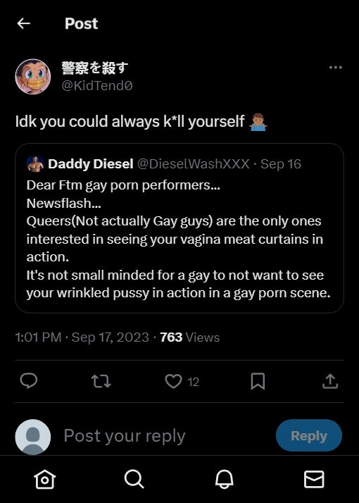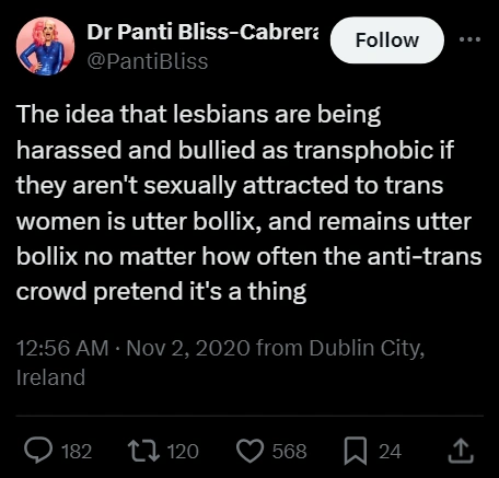 PantiBliss continued: "One random comment from an anonymous fifteen year old on a ten year old Reddit thread won't cut it." Several people responded to PantiBliss' tweet within 3 days, showing at least 28 examples of trans rights activist homophobia, including violent rhetoric directed at lesbians (e.g. "burn TERF lesbians") and abuse sent to gay rights veteran Fred Sargeant, calling him a "raving nonce", a "lying piece of shit" and a "kiddy fiddling little tit". This is not the only example of "progressives" calling gay men pedophiles.