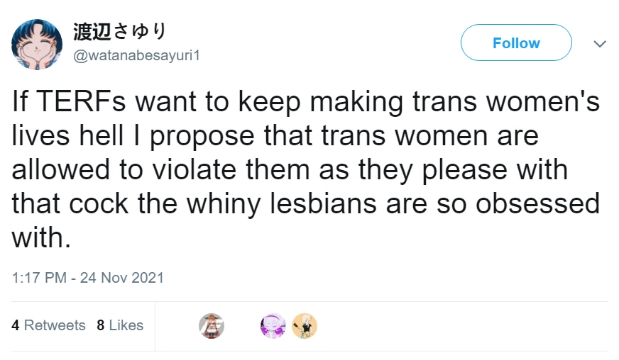 Important note: I do not believe the hateful content depicted on this site represents the majority of trans people. However, I believe it is a problem that needs to be addressed. Many trans rights activists and their supporters are not trans themselves. Talking about male violence doesn't mean most men are bad. Similarly, talking about discrimination done in the name of trans people does not mean most trans people are bad. Some trans people have bravely spoken out in support of women and LGB people, and have been ostracised from the LGBT community as a result.