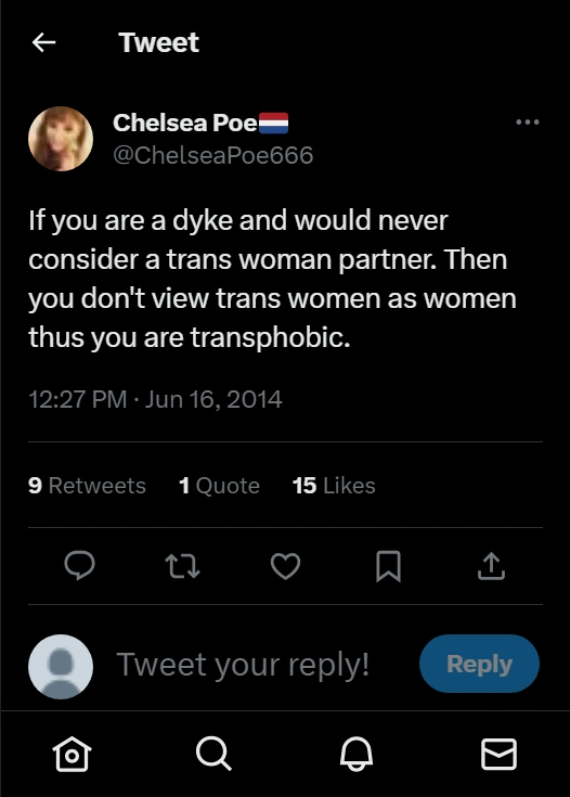 According to trans rights activists/allies, saying lesbians don't like dick is "transphobic". Single-sex lesbian events are "transphobic". Gay men saying they don't like vaginas is "transphobic". Some of them even think it's transphobic simply to be exclusively same sex attracted. And "transphobia" is not tolerated.