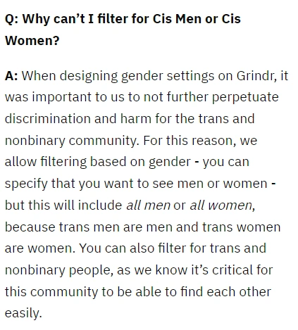 Grindr, which used to be an app for gay men, has introduced a policy which prevents users filtering by sex. Filtering for men will include "all men" (this means "cis" men and trans men (who have vaginas). However, there are still filters for trans people to find each other. Talk about double standards.