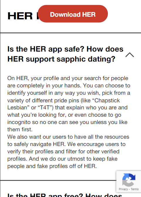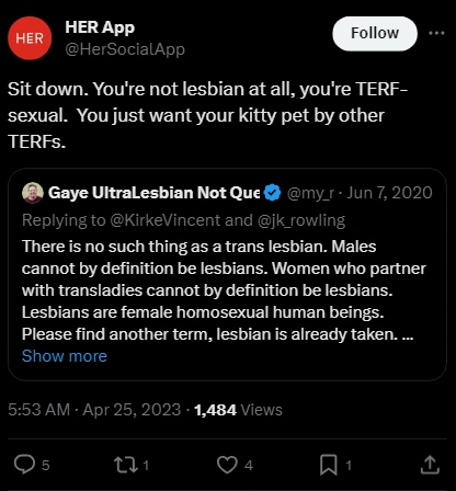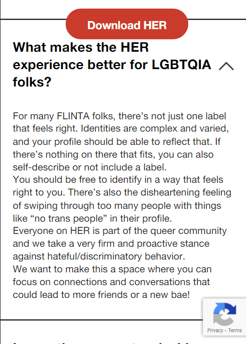 HER, which formerly described itself as "the lesbian dating app"[5][6], has now rebranded as a "sapphic dating app", "made for queers, by queers"[8][9][10]. This subtle rebranding belies a much bigger shift in attitudes. In March 2022, it released an article[7] saying its trans users "face significant challenges on dating apps". According to the article, they surveyed 500 trans and gender nonconforming users of their app and found 66% identify as trans women, and that the most common "trans-specific hurdle" was "trans-exclusionary preferences". At the end of the article they state "We’ve...kicked our TERF control into overdrive so that our users can report phobic profiles, posts, and messages. We are more explicit than ever that that behavior is not...welcome on HER." In a world where lesbians are pressured to include opposite sex in their dating pool lest they be called transphobic, one wonders what it might be like to be a lesbian on such an app.