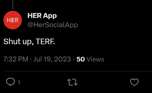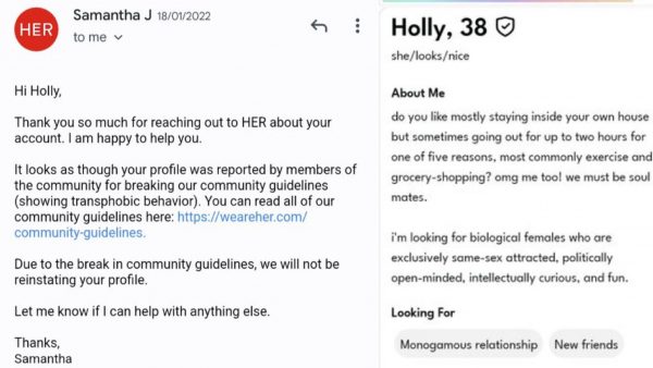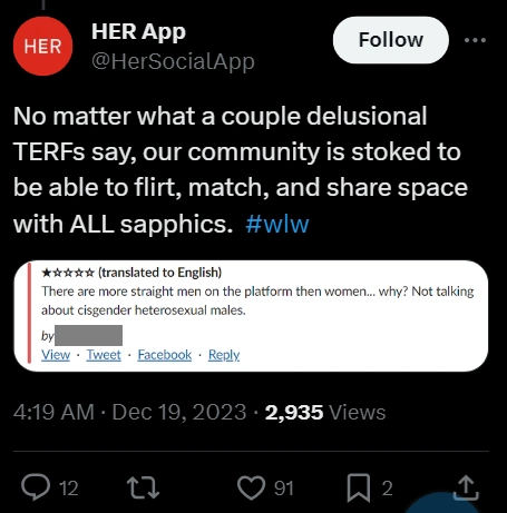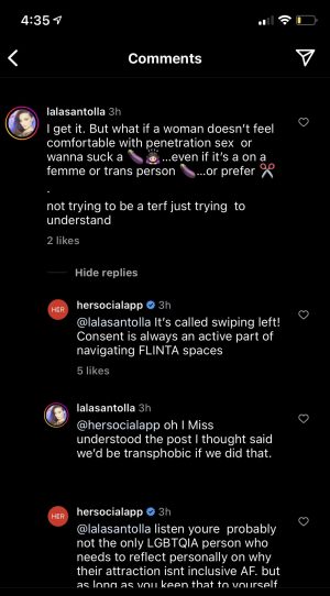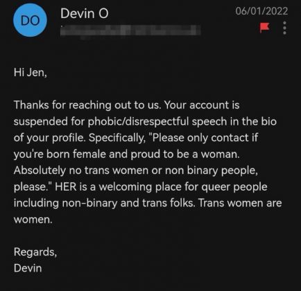 Reduxx reported that several lesbians claimed to have been banned from HER for having things like "biological women only", "no trans women" and "adult human female" in their profile. The article also includes a screenshot from HER's instagram account, where they encourage a lesbian to "reflect" on why her "attraction isn't inclusive AF", telling her to "keep that to yourself".