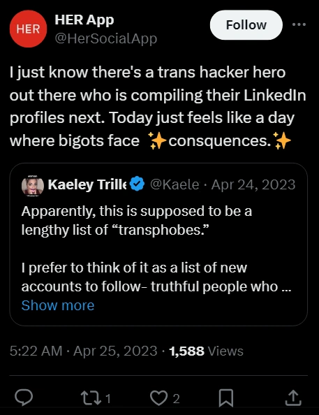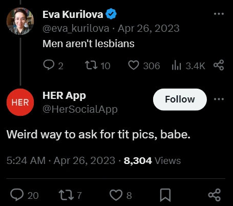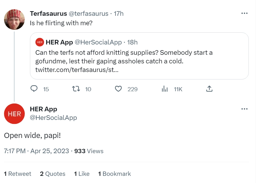 NBC News published an article[13] about the app, quoting HER's CEO Robyn Exton several times, but not interviewing any victims of its homophobic policies. However, they make their views clear when they quote Exton saying "When you are explicitly stating that you will not consider a whole identity group, that tosses discriminatory behavior." HER's abusive tweets got their Twitter account temporarily suspended, and the article quotes Exton saying it was "largely because of the interaction with the ‘TERF’ audience, who then just kept repeatedly reporting our account." The article was published on April 28, 2023, shortly after some of the abusive, sexually harassing posts which can be found above.