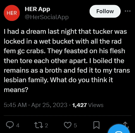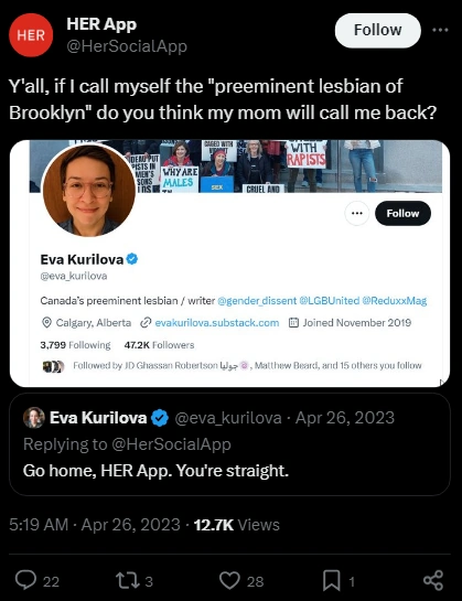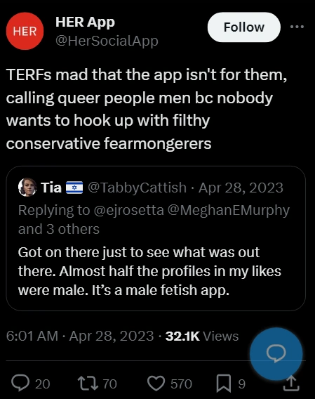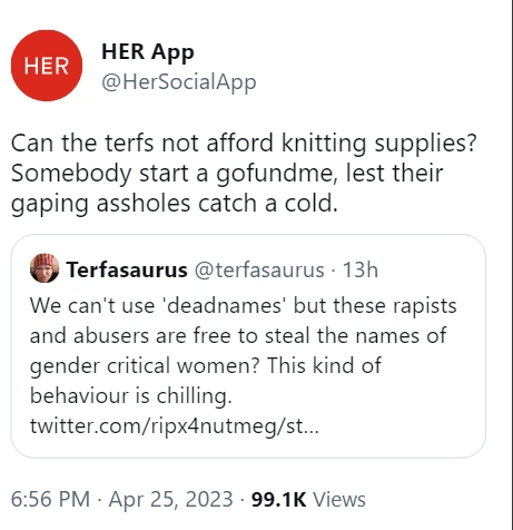 LGBT "news" outlet Pink News also published an article[14] claiming HER's Twitter account was suspended due to a "pile-on", in which "anti-trans bigots reported the app's Twitter account in droves". The article says the app's social media team responded to 'an onslaught of "violent messages" from anti-trans activists', but provides no evidence of such messages. However, there were several abusive and sexually harassing posts made from HER's Twitter account a few days before Pink News published the article on April 28, 2023 (see above). The article says HER CEO Robyn Exton is '"so sick" at the levels of "aggression and violence" so-called gender critical activists aim at the app'. What violence are they talking about? Who knows? They provide zero evidence of this claim. According to the article, Exton said "HER has always been a platform that is for...anyone who identifies as a woman".