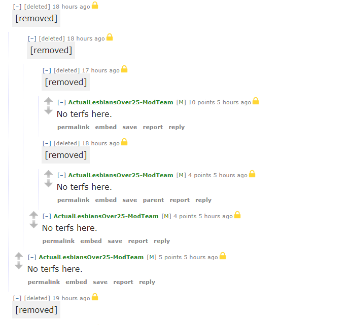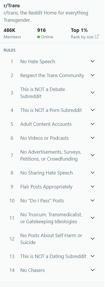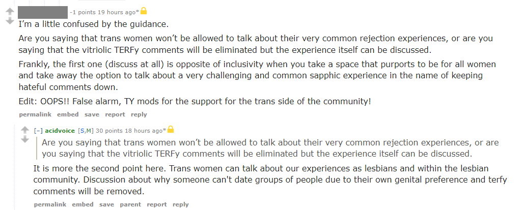 The trans subreddit also features a strict "No Chasers" rule. It reads: "r/trans is a safe space for trans people, their stories, discussions, and content. It is NOT a place for people to fetishize us, attempt to hit on or pick up users, or any other general creepy behavior. Similarly, if such behavior is seen in your account’s post/comment history, you are not permitted to participate in r/trans. The Moderation Team maintains discretion as to what is included in this rule."[1][2] The mods clearly understand the importance of minorities having spaces for themselves, away from discrimination or unwanted sexual attention. If only trans rights activists afforded the same respect to lesbians' boundaries online and offline.