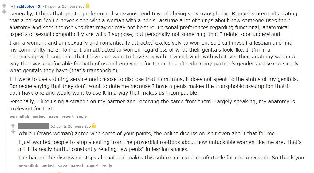 Lesbian subreddit bans lesbians from saying they're not attracted to people with penises