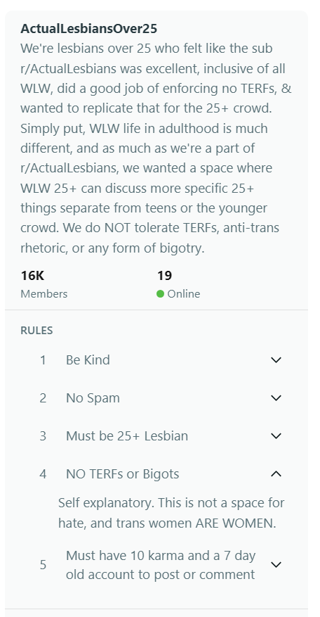 The subreddit's description starts off by praising the subreddit r/ActualLesbians, saying it's "inclusive of all WLW, did a good job of enforcing no TERFs". At the end of the description, they say "We do NOT tolerate TERFs, anti-trans rhetoric, or any form of bigotry". Rule 4 of r/ActualLesbiansOver25 is "NO TERFs or Bigots", and states "trans women ARE WOMEN". Rule 1 is "Be Kind", though I struggle to see how it's kind to prevent lesbians from discussing lesbian sexuality on a lesbian subreddit.