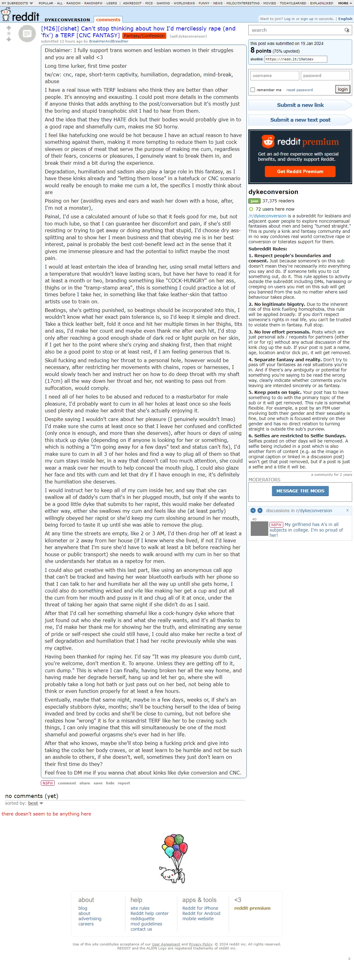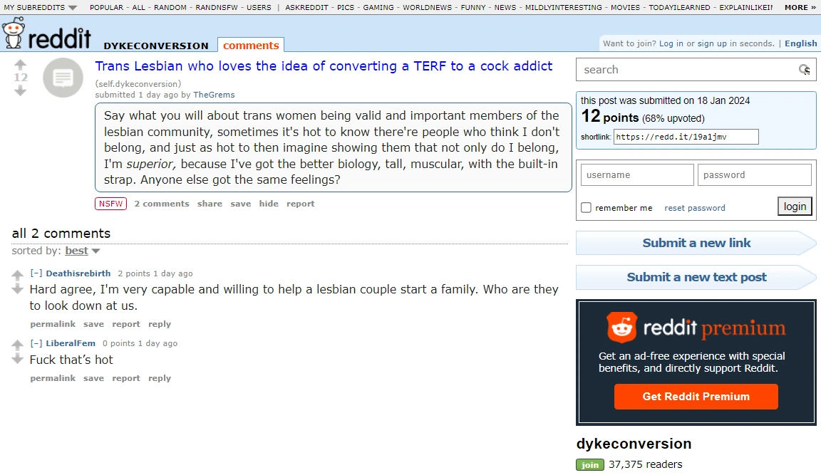 r/dykeconversion claims to be 'a subreddit for lesbians and adjacent queer people to explore nonconsensual fantasies about men and being "turned straight."'. Two posts from the subreddit which have been archived on archive.today are linked below as examples. One is from a "trans lesbian" who describes themselves as "superior", presumably superior to biological women. The other is a "cishet" (non-trans heterosexual) man who wrote a 1,294 word violent sexual fantasy about "TERF" lesbians. As of January 2024, the sidebar on the archived posts from r/dykeconversion say it has been "a community for 2 years".