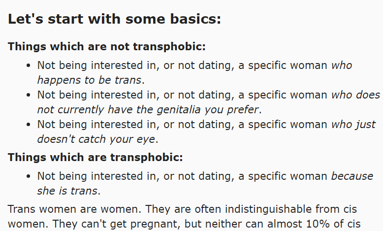 The last dot point says it's "transphobic" to not be interested in "a specific woman because she is trans". For clarity, this user thinks it's "transphobic" for a lesbian to not be interested a member of the opposite sex, if they have taken steps to appear to be the same sex. This is a great example of how reframing things can make the acceptable seem unacceptable, and vice versa. This is not OK. Even if (as is the case here) the trans woman has had genital surgery. They are asserting that lesbians' sexual orientation is wrong.
