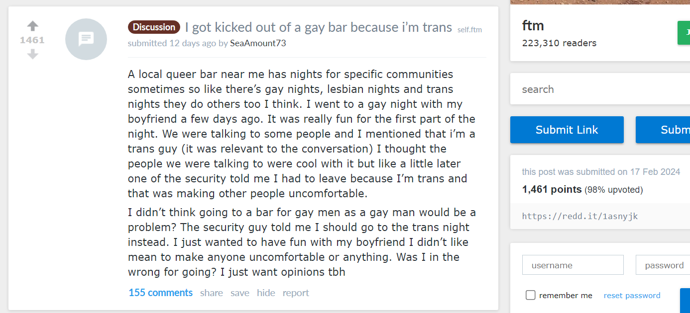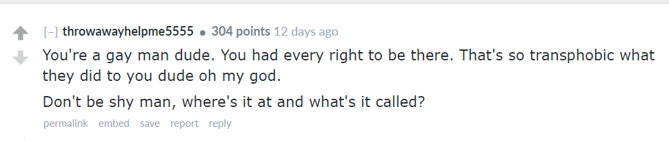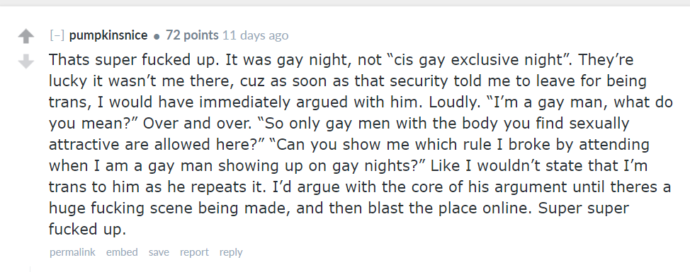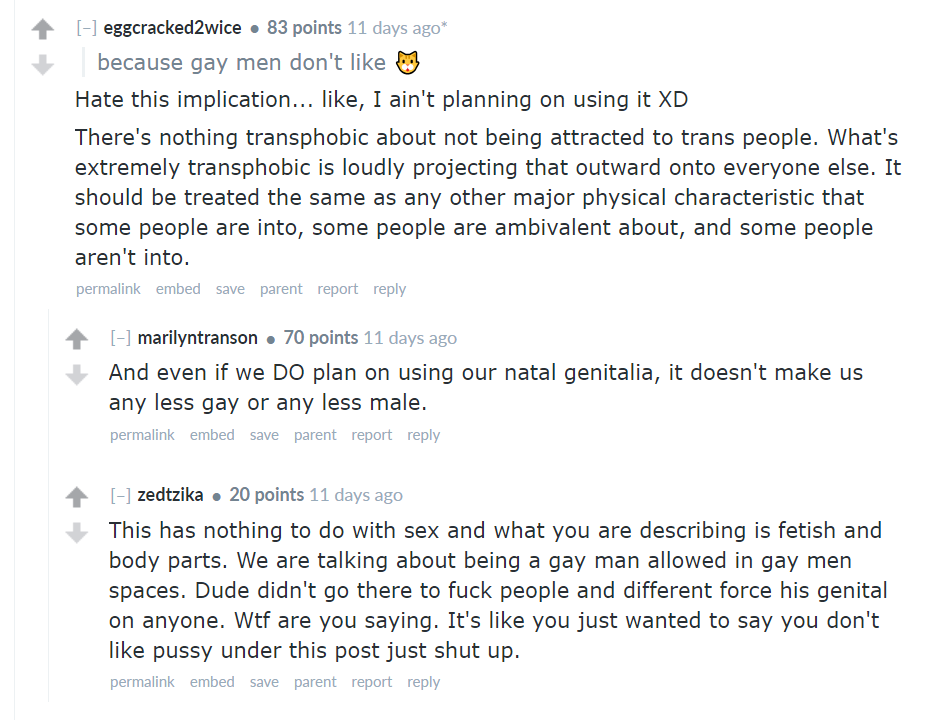 Reddit user said they would "make a huge fucking scene" if they were excluded from a gay mens' space because of their female sex