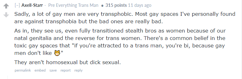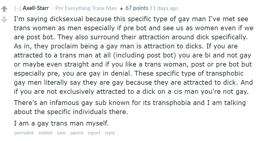 One user described gay men as "not homosexual but dick sexual", and implied that the idea that gay men don't like vaginas is "toxic"