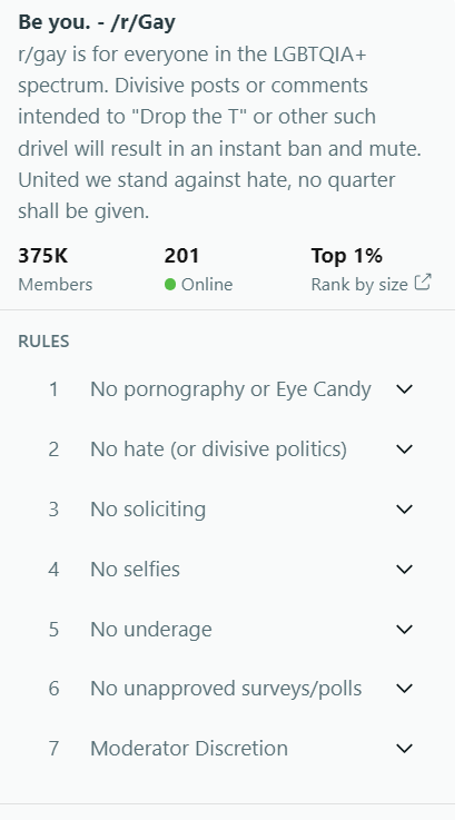 As of Feb 2024, the r/gay subreddit has over 375,000 members. Its description reads as follows: 'r/gay is for everyone in the LGBTQIA+ spectrum. Divisive posts or comments intended to "Drop the T" or other such drivel will result in an instant ban and mute. United we stand against hate, no quarter shall be given.' The one and only moderator-pinned post is about "trans rights".