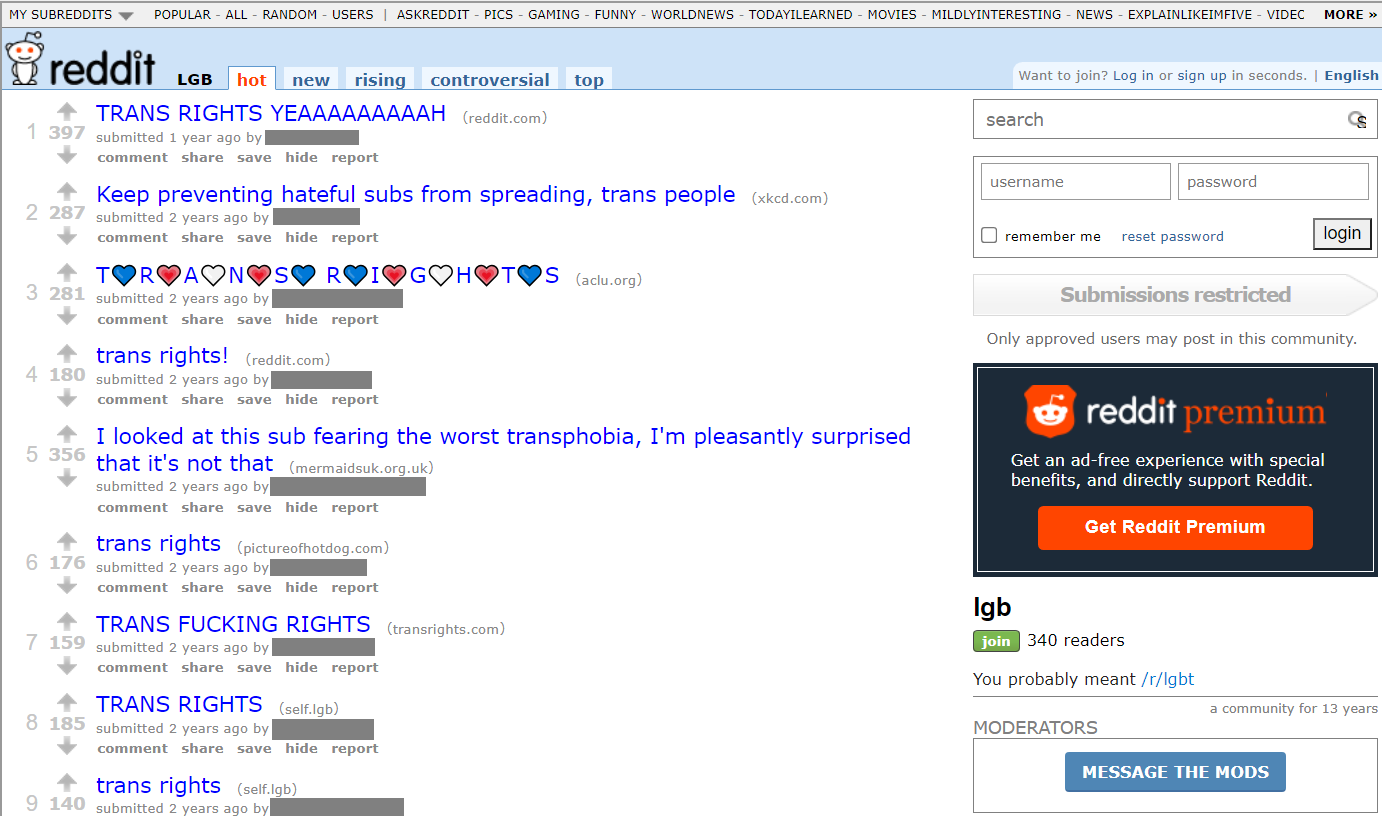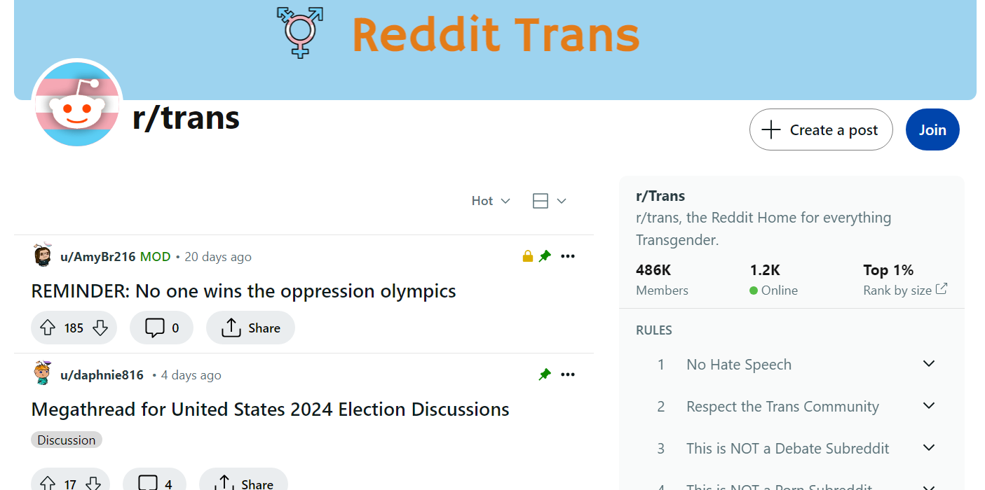 However, r/trans makes its goals relatively clear; its description reads "r/trans, the Reddit Home for everything Transgender". One of the rules of r/trans is to "respect the trans community". Interestingly, r/gay has no such equivalent rule.