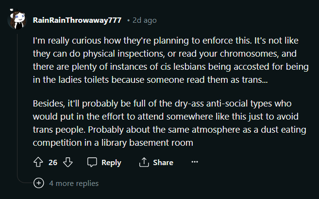 Trans woman moderator of the subreddit r/ActualLesbiansOver25 says posts "expressing transphobia (e.g. talking about how certain genitals...completely disqualify you from being attracted to [someone] as a partner)" will be removed, with "serious offenses" leading to a ban.