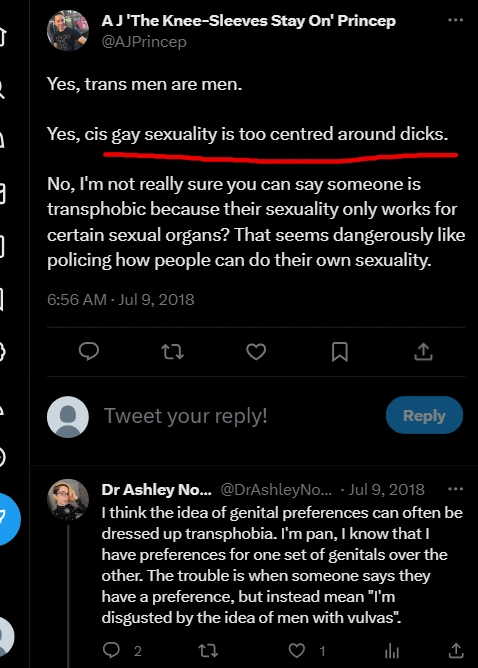 The quoted tweet is Desmond implying it's transphobic for gay men not to be attracted to biological women. Also notice the use of the word "queer", which is a homophobic slur, and is still seen as a slur by many gay people.