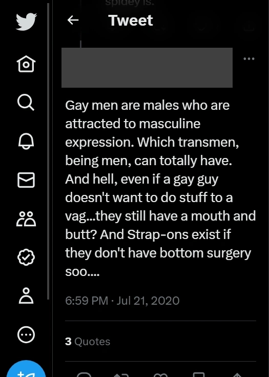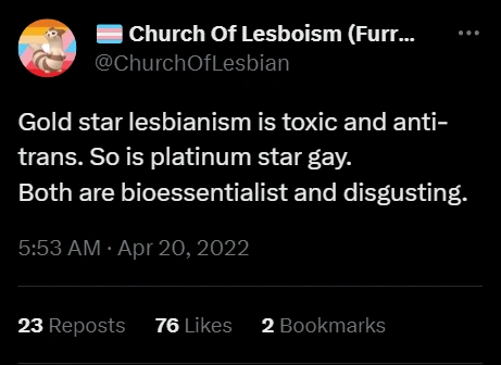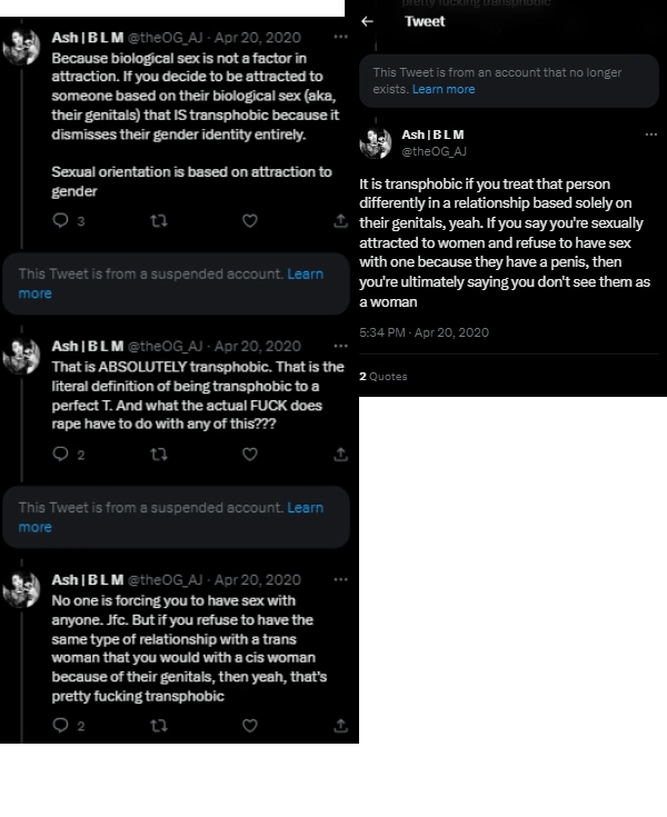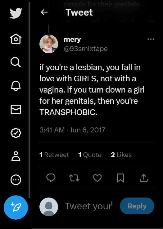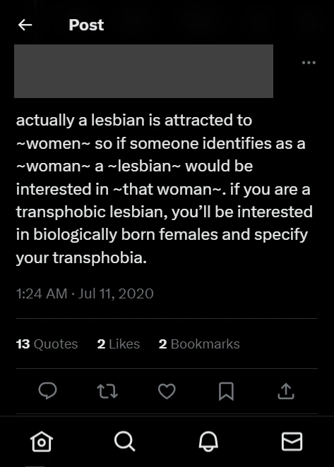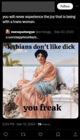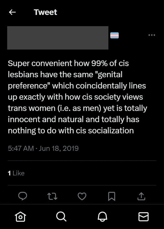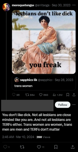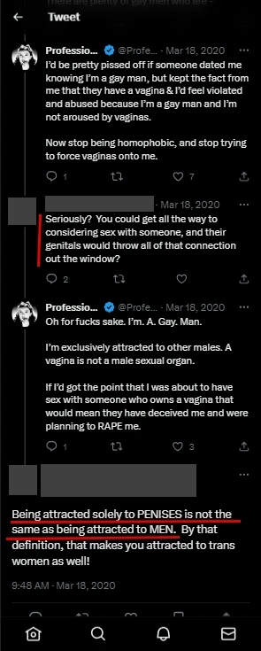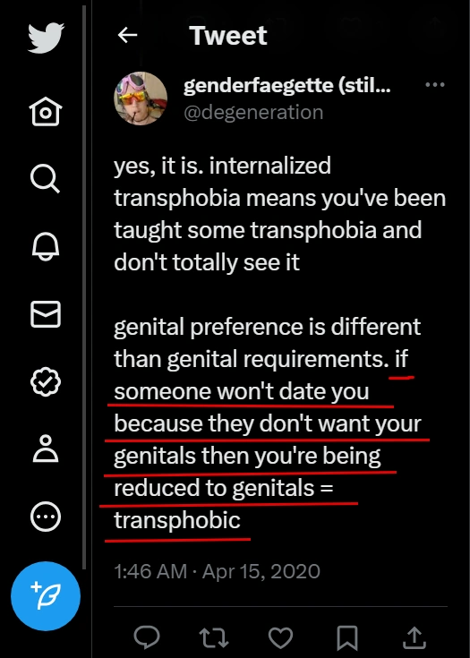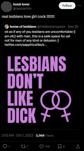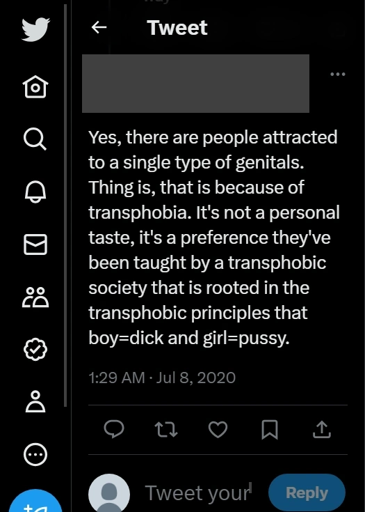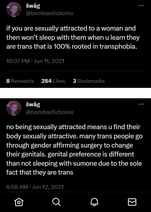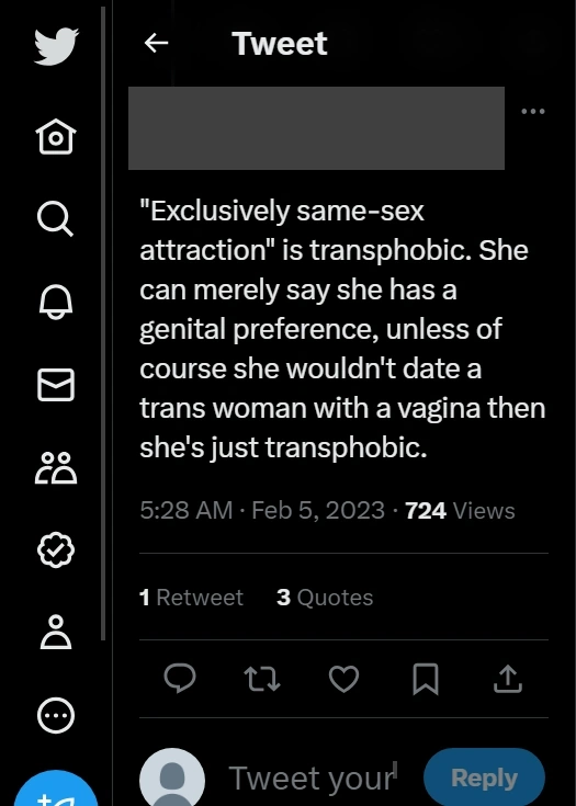 Tag description: Far right religious groups believe homosexuality (same sex attraction/sex) is immoral, and call it an abomination. They believe the only moral sexuality is exclusive opposite sex attraction. Some describe the pressure lesbians and gays experience to enter heterosexual relationships as "compulsory heterosexuality". Extremist trans rights activists and their allies believe exclusive same sex attraction is transphobic, and call it a genital preference. They believe one should be open to sex with people regardless of what genitals they have. While this technically means heterosexuality is also "transphobic", most of the hate is targeted at lesbians and gays who refuse to go along with this. Some LGBT news sites, mainstream media and other websites have published articles sharing this homophobic sentiment. In real life, some lesbians have reported being verbally abused and sexually assaulted because they sexually rejected trans women.