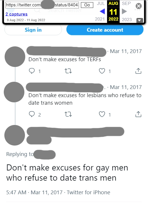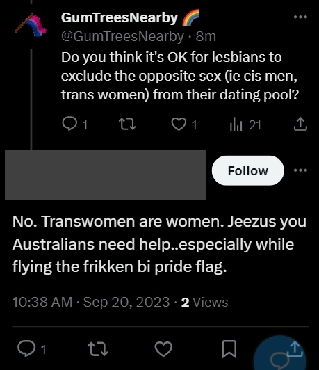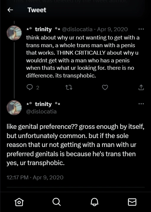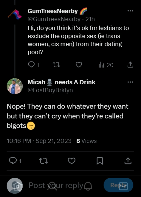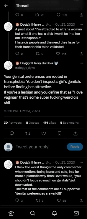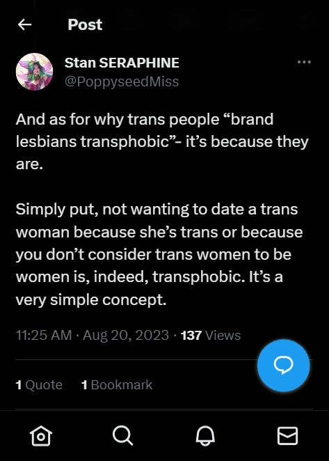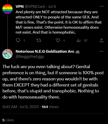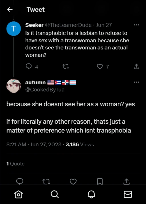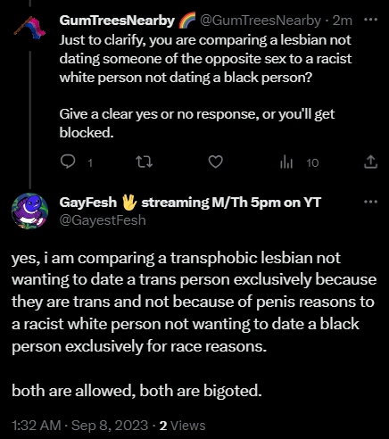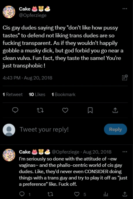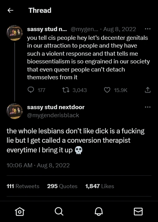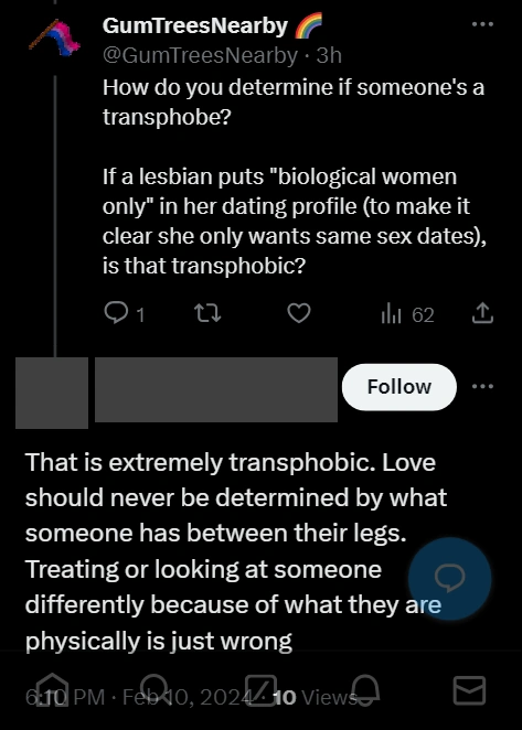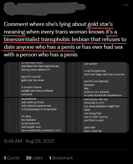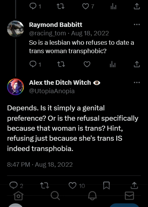 Tag description: Far right religious groups believe homosexuality (same sex attraction/sex) is immoral, and call it an abomination. They believe the only moral sexuality is exclusive opposite sex attraction. Some describe the pressure lesbians and gays experience to enter heterosexual relationships as "compulsory heterosexuality". Extremist trans rights activists and their allies believe exclusive same sex attraction is transphobic, and call it a genital preference. They believe one should be open to sex with people regardless of what genitals they have. While this technically means heterosexuality is also "transphobic", most of the hate is targeted at lesbians and gays who refuse to go along with this. Some LGBT news sites, mainstream media and other websites have published articles sharing this homophobic sentiment. In real life, some lesbians have reported being verbally abused and sexually assaulted because they sexually rejected trans women.