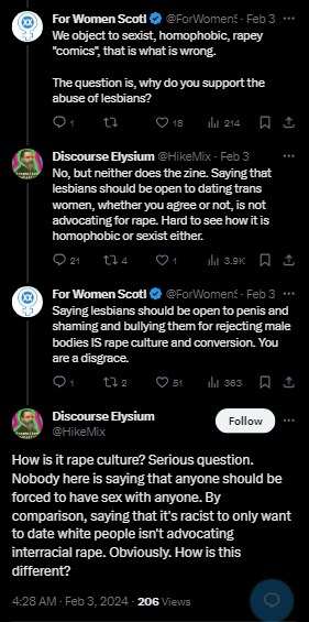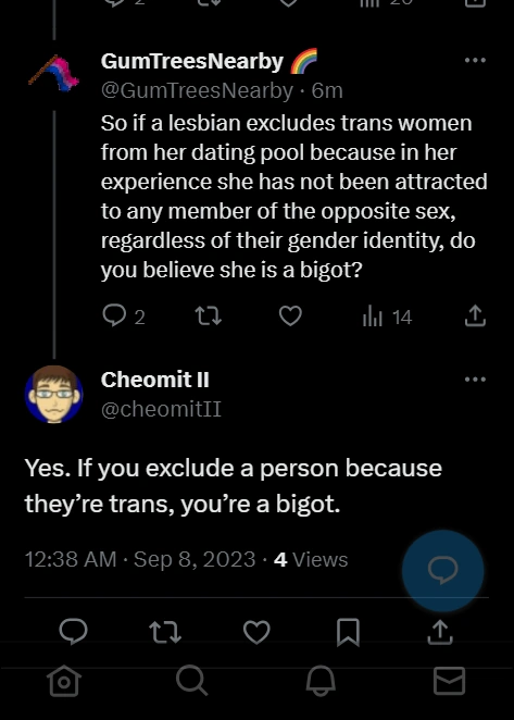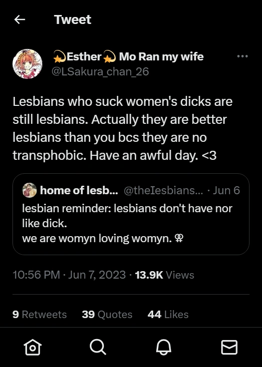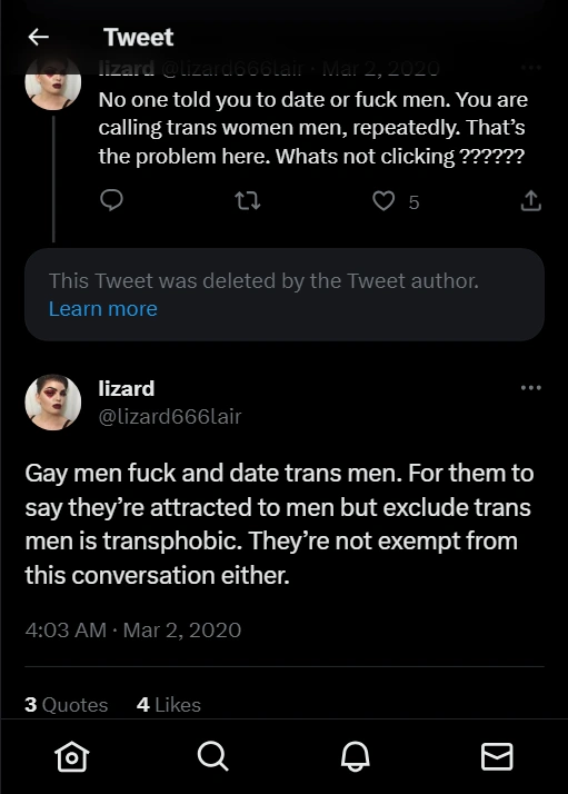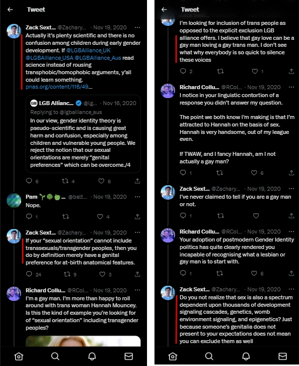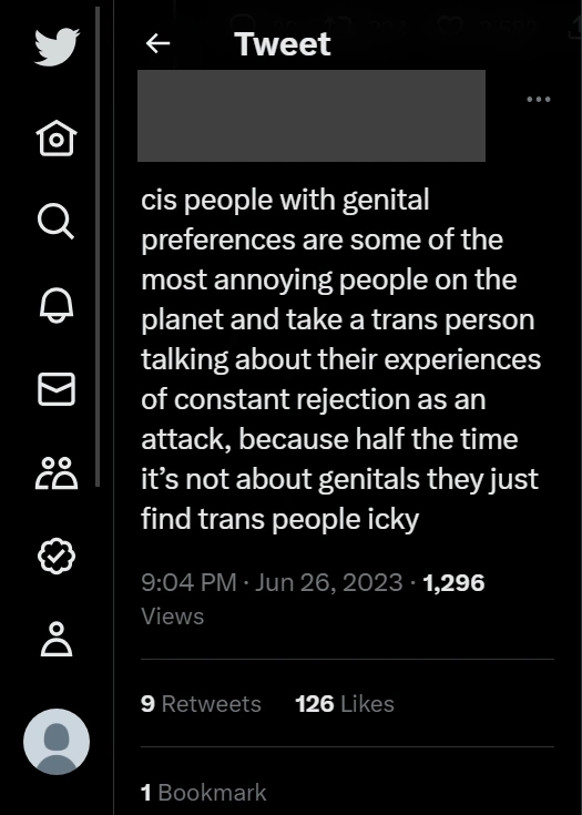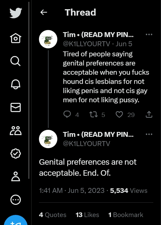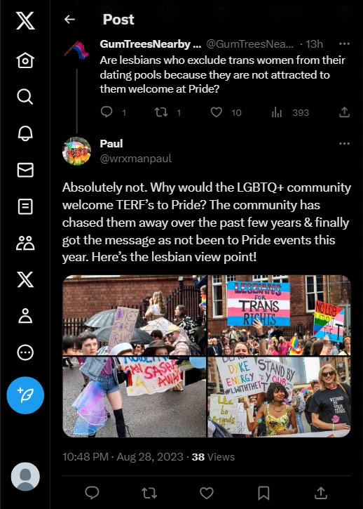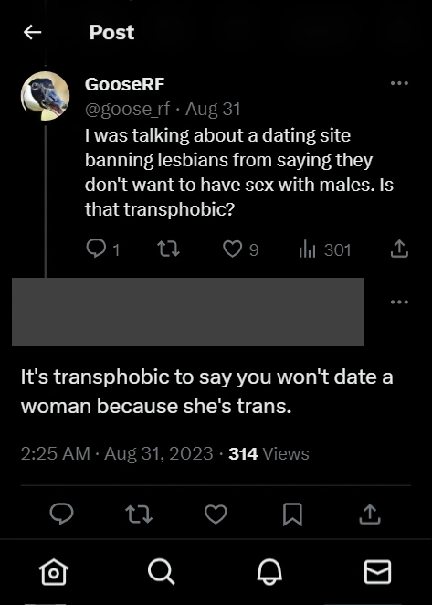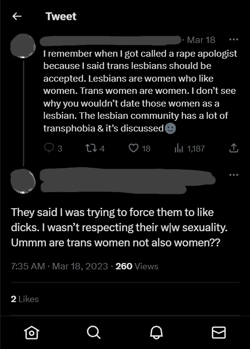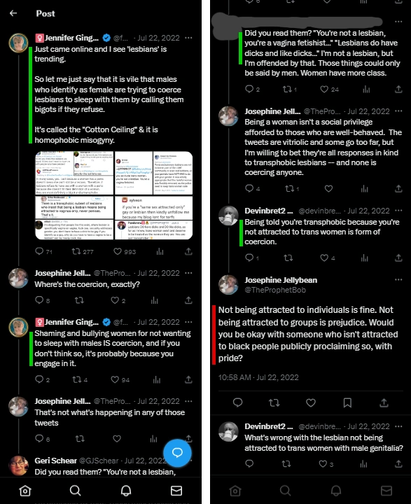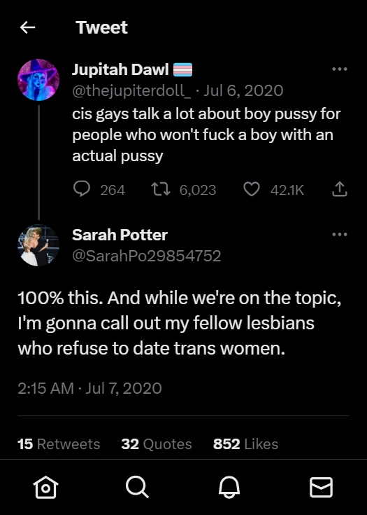 Tag description: Far right religious groups believe homosexuality (same sex attraction/sex) is immoral, and call it an abomination. They believe the only moral sexuality is exclusive opposite sex attraction. Some describe the pressure lesbians and gays experience to enter heterosexual relationships as "compulsory heterosexuality". Extremist trans rights activists and their allies believe exclusive same sex attraction is transphobic, and call it a genital preference. They believe one should be open to sex with people regardless of what genitals they have. While this technically means heterosexuality is also "transphobic", most of the hate is targeted at lesbians and gays who refuse to go along with this. Some LGBT news sites, mainstream media and other websites have published articles sharing this homophobic sentiment. In real life, some lesbians have reported being verbally abused and sexually assaulted because they sexually rejected trans women.