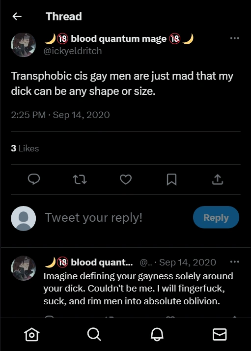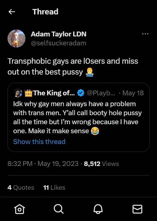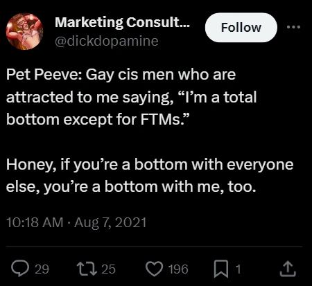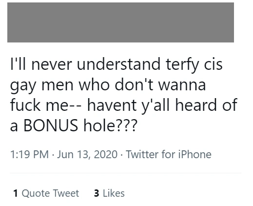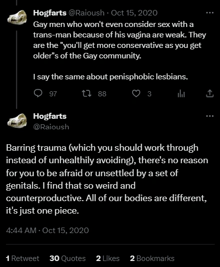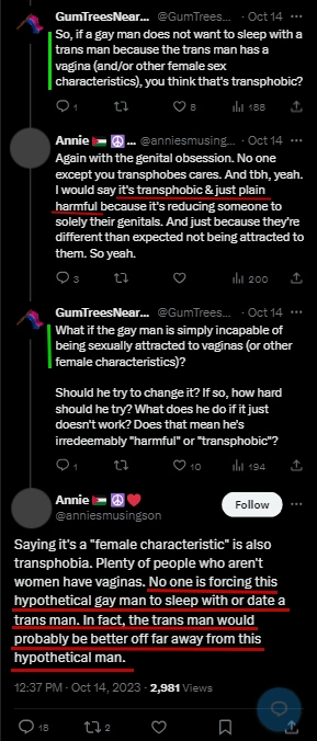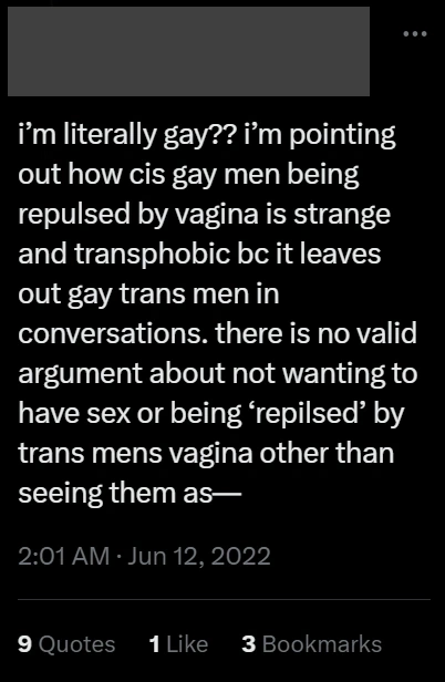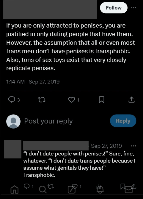 It's "transphobia" for gay men to not want trans men, according to this person. Also, a sex toy or a surgically constructed neophallus are not the same thing as a real penis.