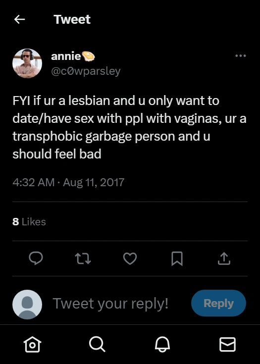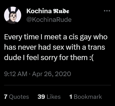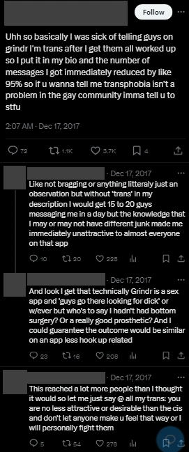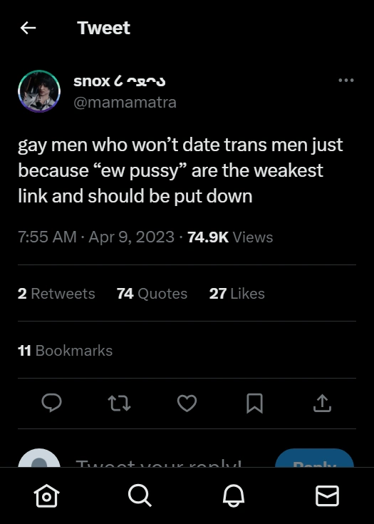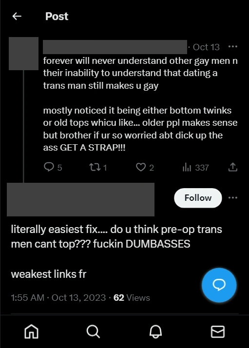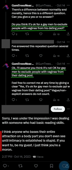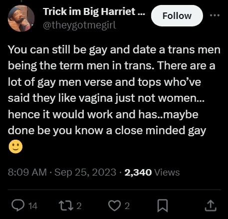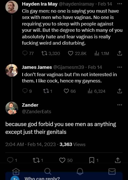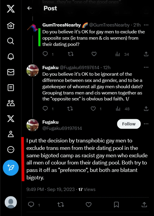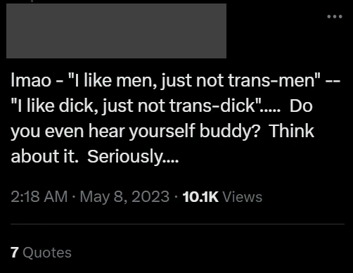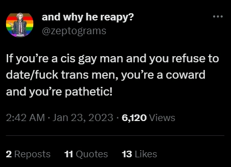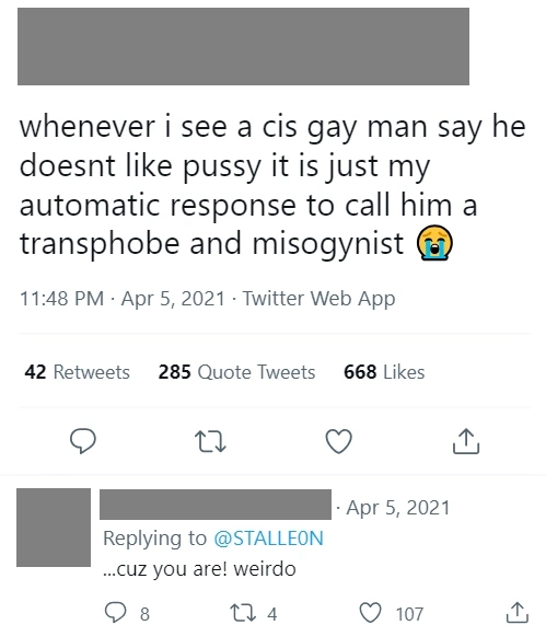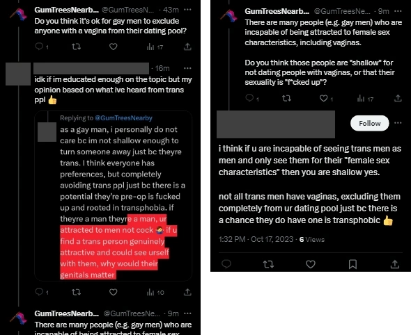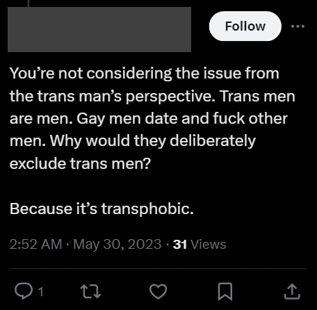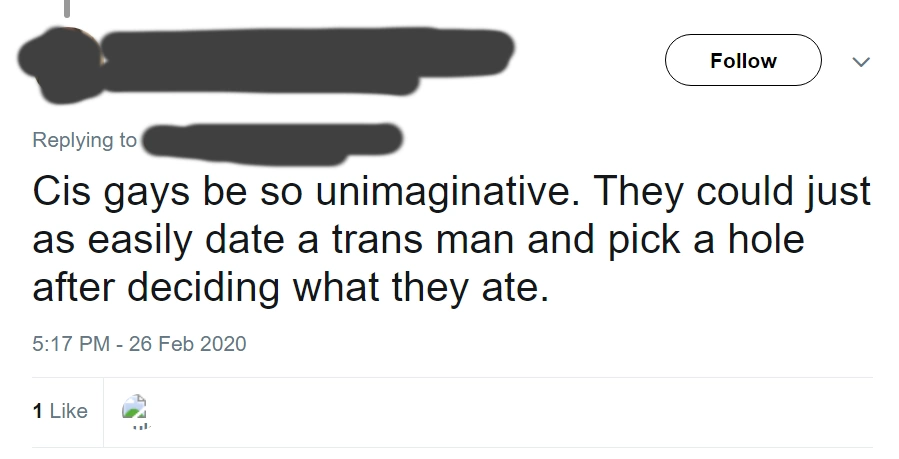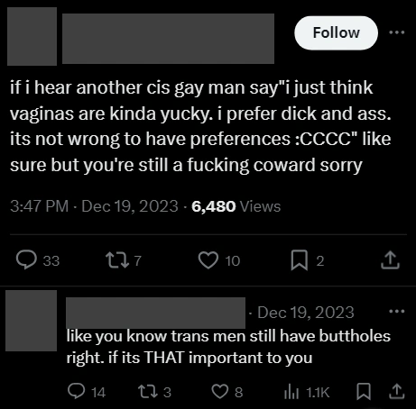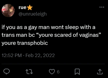 Gay men not dating trans men (people with vaginas) should be "exposed", according to this person.