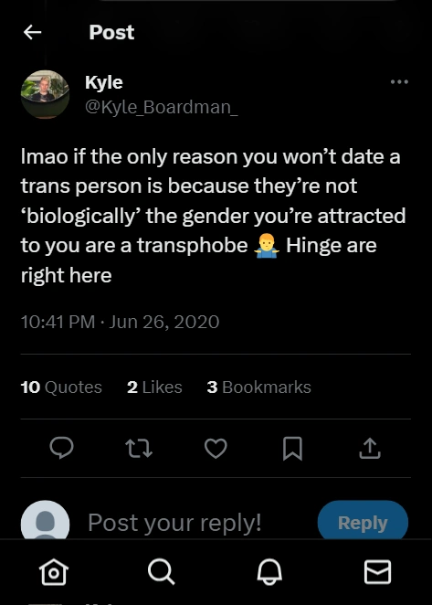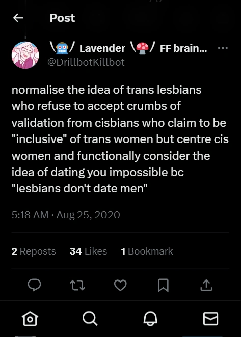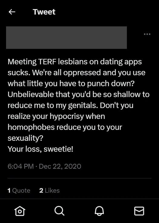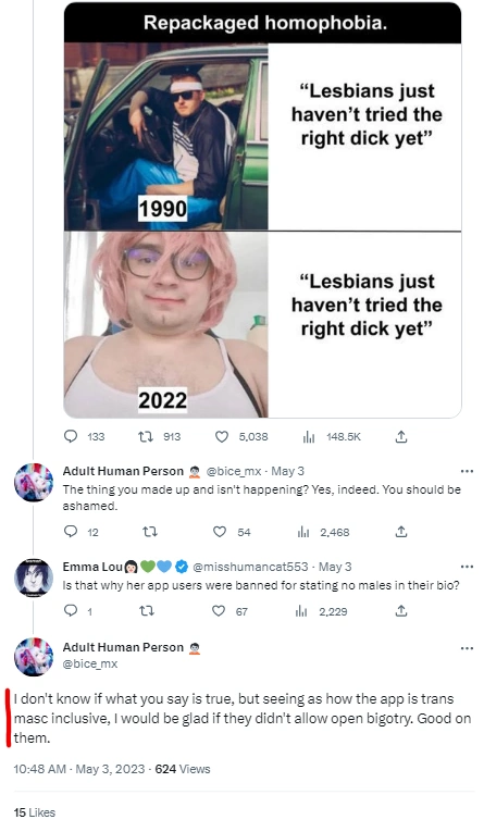 This person seems to think it's a good thing lesbians are banned from lesbian dating apps for saying they're lesbians.
