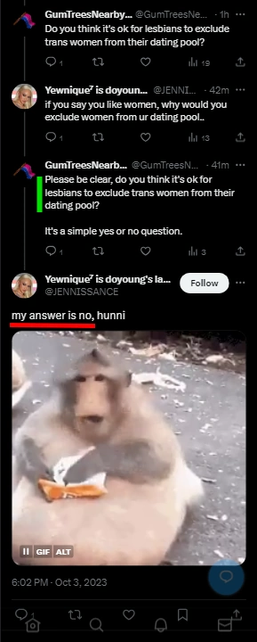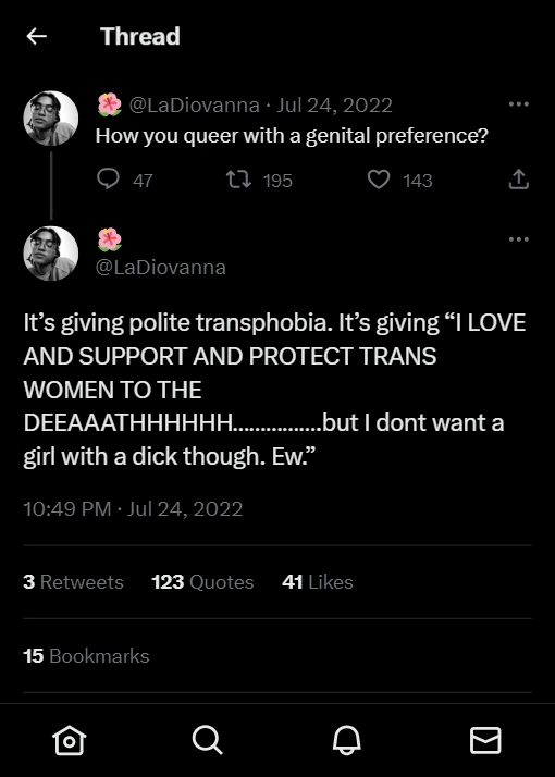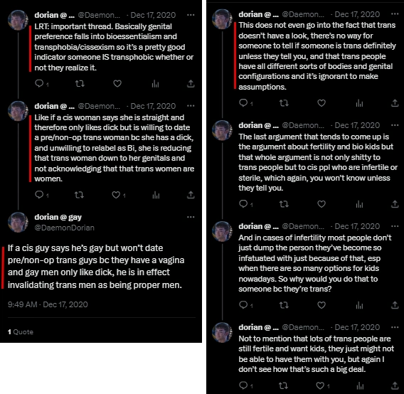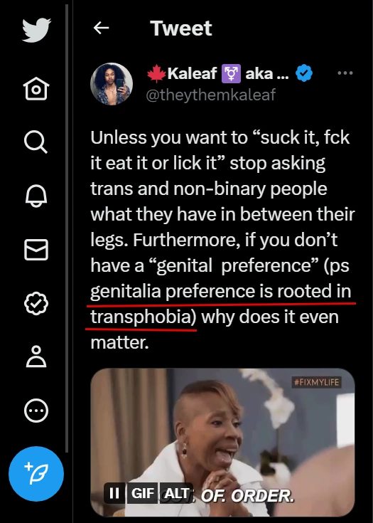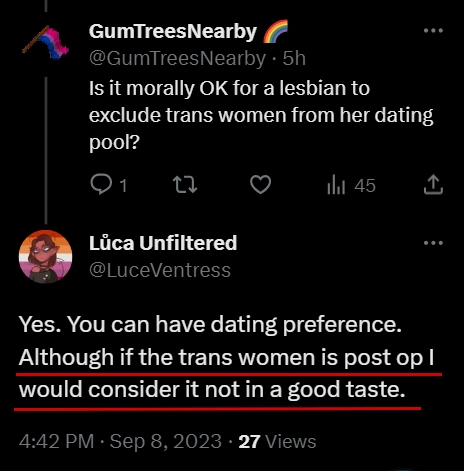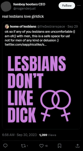 calling a lesbian "transphobic" for mocking someone who said genital preferences are transphobic.