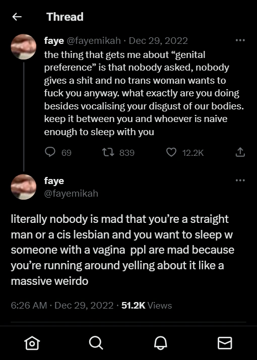 If you follow the links, you'll see Hayden has written an entire thread about how horrible gay men who say "vaginas are gross" are. This kind of guilting and emotional manipulation is common in trans rights activist circles.