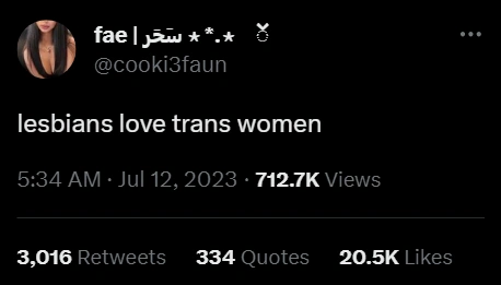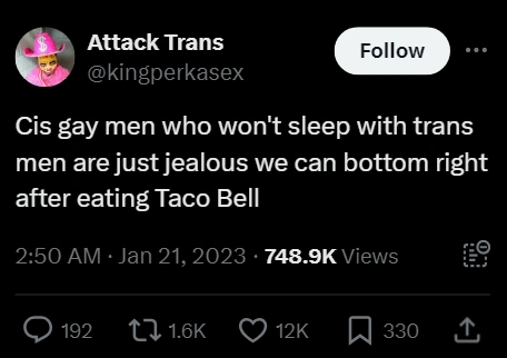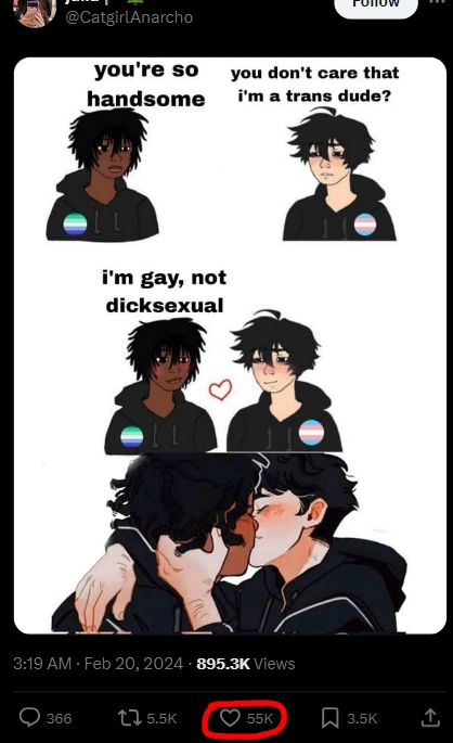 According to this meme, homosexuals are happy to have relationships with trans men (who have vaginas), and if they're not, they're not gay, they're "dicksexual". As of 21 Feb 2024, this tweet has over 55 000 likes.
