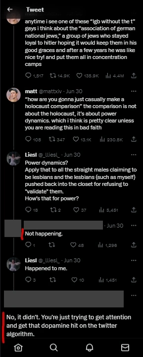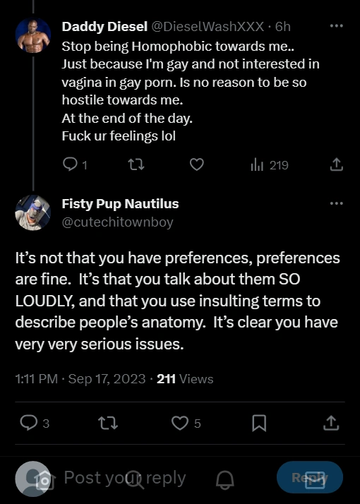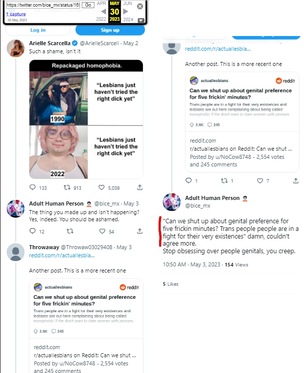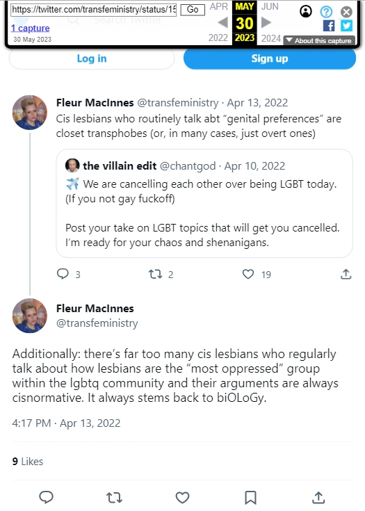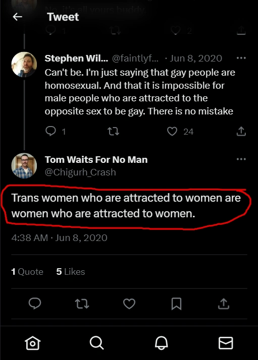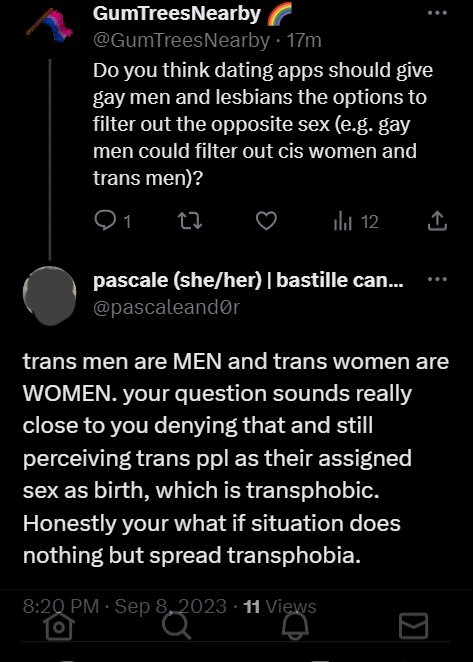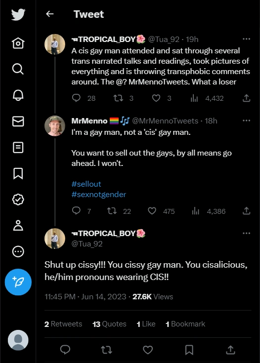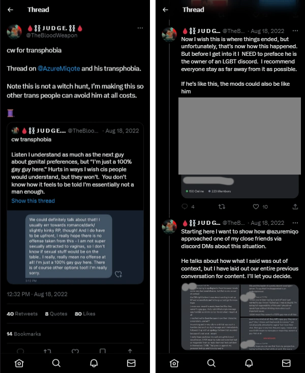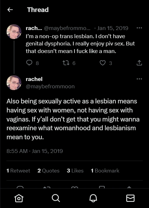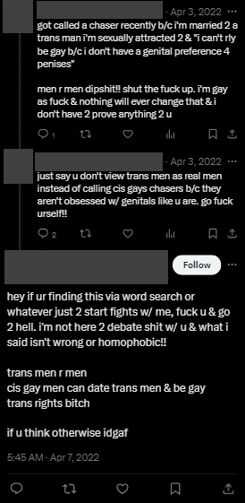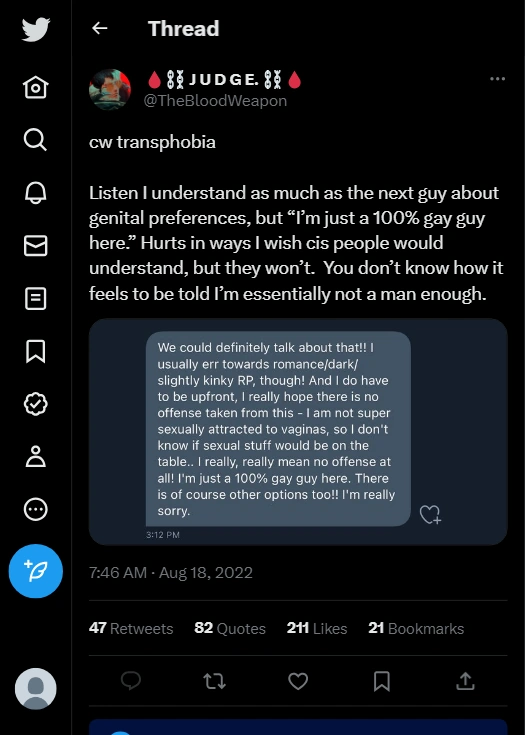 Gay man says he's not interested in vaginas because he's "100% gay". Trans man takes offense & writes a Twitter thread about the gay man's "transphobia", so "trans people can avoid him at all costs." including screenshotting a Discord server run by the man, & private messages showing the gay man issuing a grovelling apology. He says this is not a witch hunt. This kind of manipulative, emotionally abusive rhetoric and attempts to cancel are common in trans activist circles, although the victims seem to usually be women. (see: JK Rowling, Kathleen Stock, Maya Forstater)