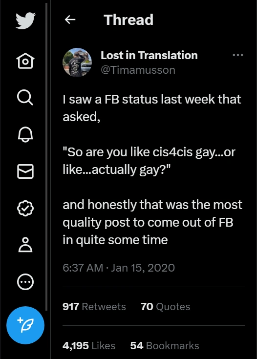 "Gay history is actually just trans history" has to be some of the worst historical erasure of LGB people I've ever seen.