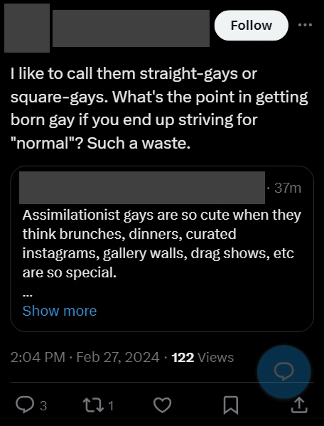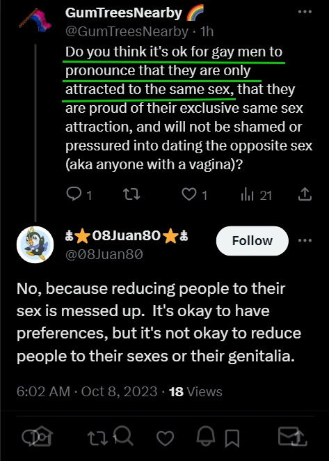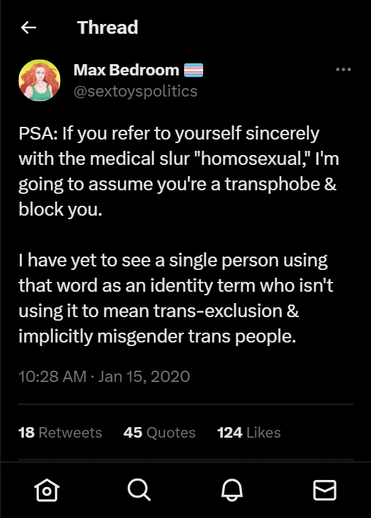 In other words, "you can be gay, just don't shove it in my face". This is a good demonstration of how trans activism is harmful to gay rights; this person is a trans man - a biological female - who identifies as gay, and who is now trying to police how gay men talk about their sexuality.