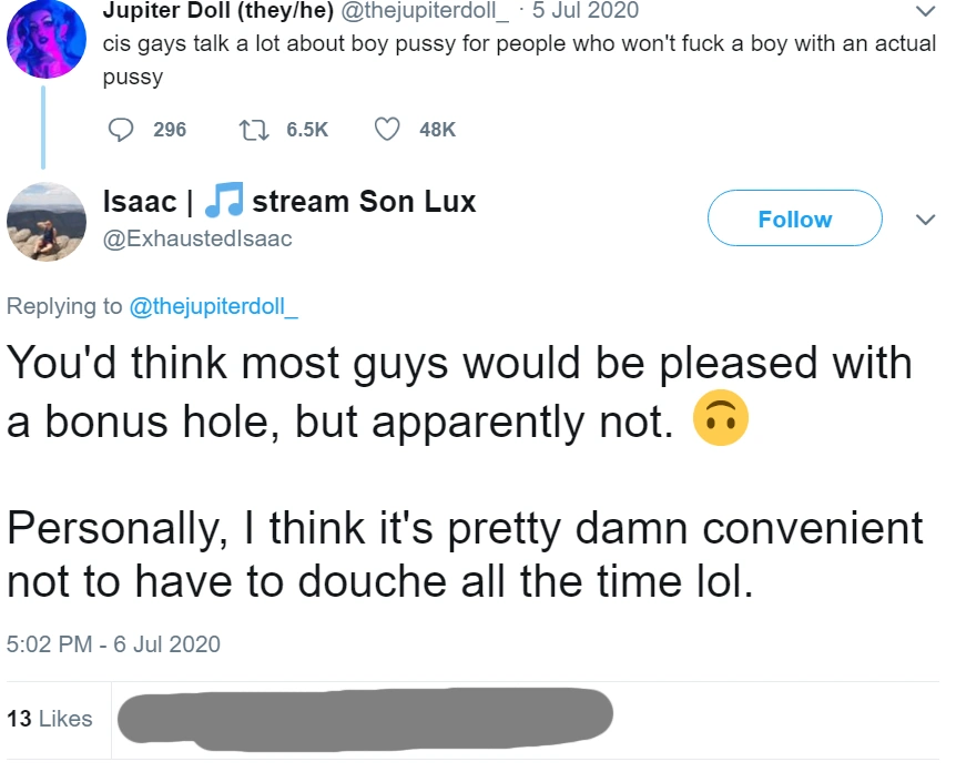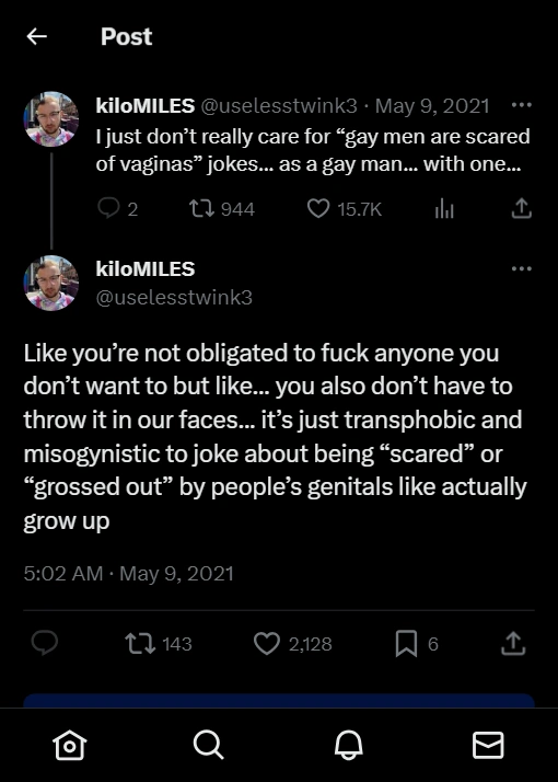 If you follow the links, you'll see Hayden has written an entire thread about how horrible gay men who say "vaginas are gross" are. This kind of guilting and emotional manipulation is common in trans rights activist circles.