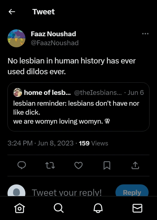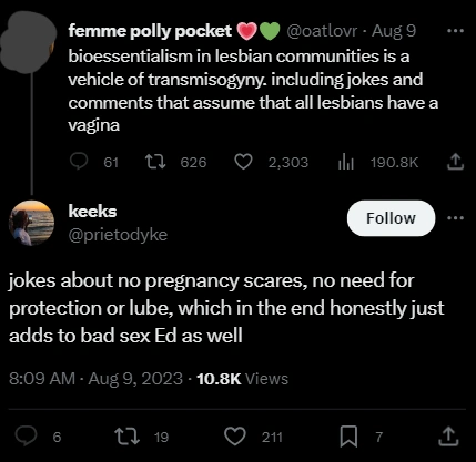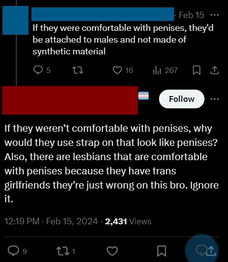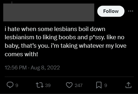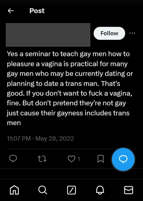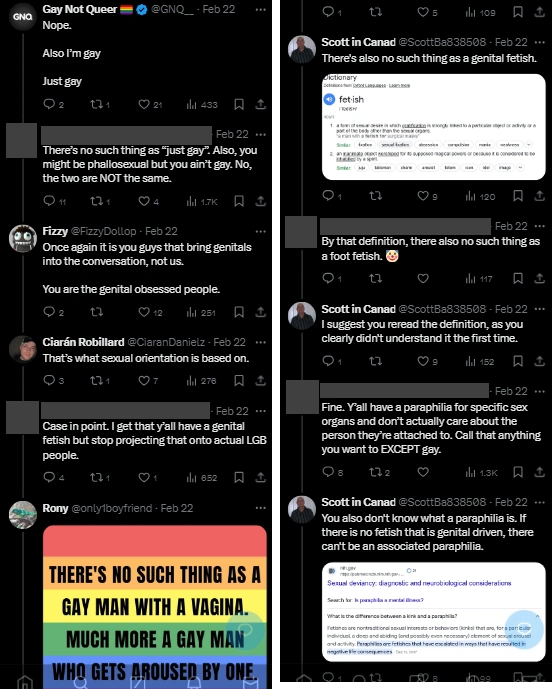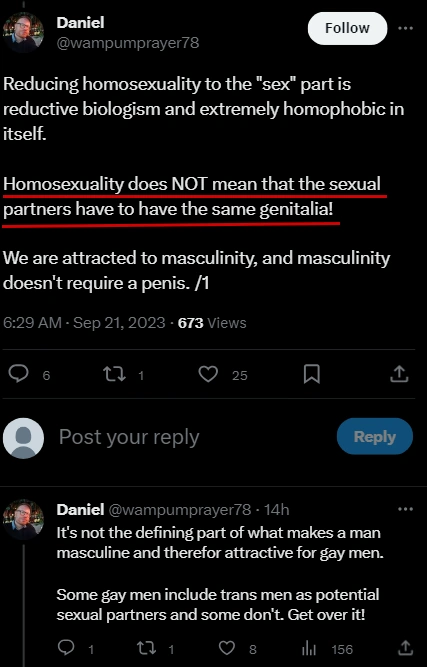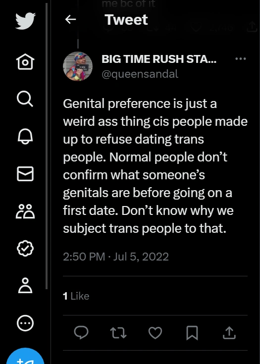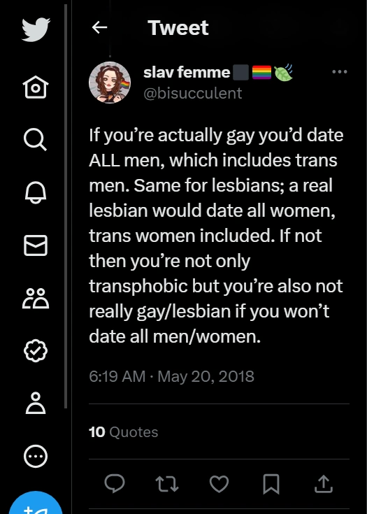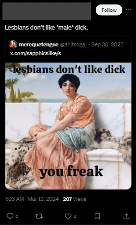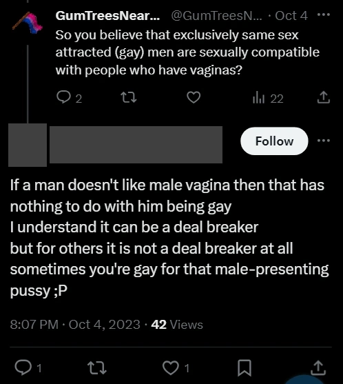 According to this meme, homosexuals are happy to have relationships with trans men (who have vaginas), and if they're not, they're not gay, they're "dicksexual". As of 21 Feb 2024, this tweet has over 55 000 likes.