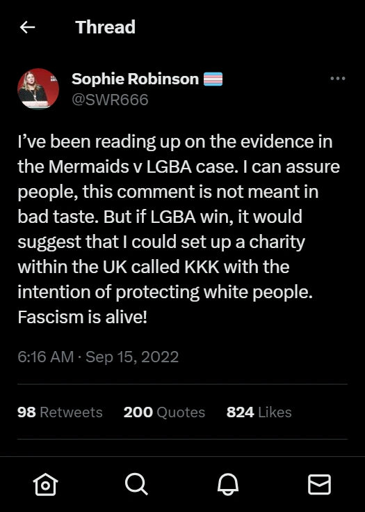 Compares lesbians, gays and bisexuals to white people, and the LGB Alliance, a charity for LGB people, to the KKK.