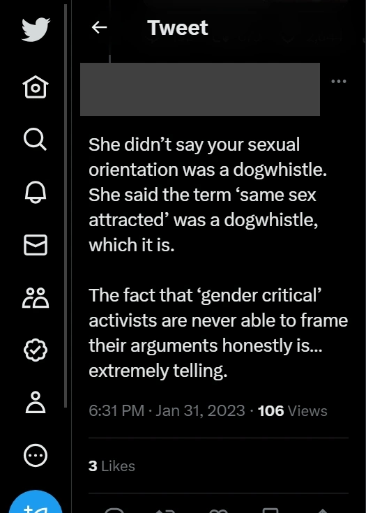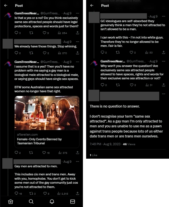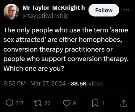 Trans rights activists/allies really don't seem to like people describing themselves as same sex attracted, perhaps because it threatens their narrative that homosexuality is based on gender.