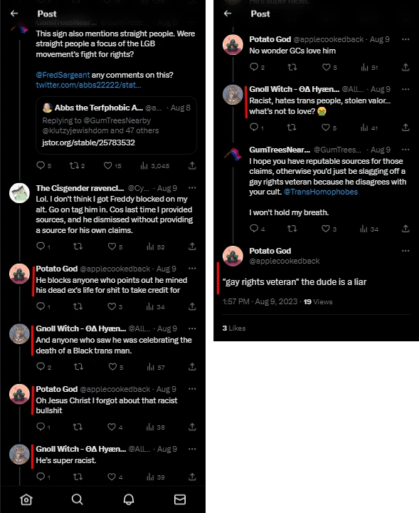 People who oppose trans rights activists are regularly abused and smeared. This includes gay rights veterans like Fred Sargeant, who was outside the Stonewall Inn when the riots started.