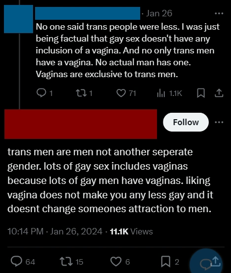 Gay man says he's not interested in vaginas because he's "100% gay". Trans man takes offense.