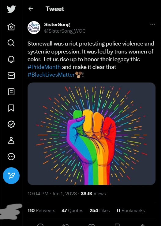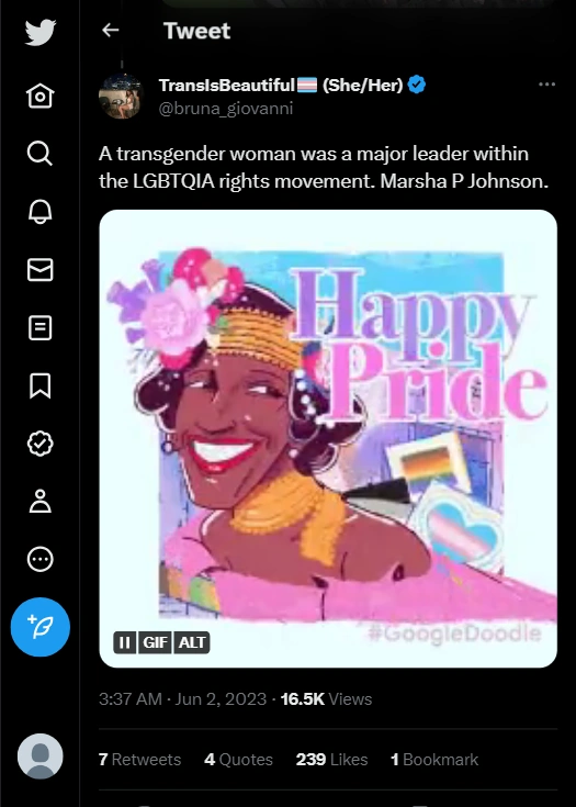 Tag description: The assertion that gay people owe trans people their rights is commonly used by trans rights activists and their allies to try and shame gays and lesbians who dare oppose them. They often claim that "black trans woman" Marsha P. Johnson started the Stonewall Riots in the US in 1969, despite the fact Johnson identified as a man and did not arrive at the Stonewall Inn until long after the riots started. Also, gay rights were being advanced before this. Veteran gay rights activist and Gay Liberation Front co-founder Bev Jackson says that the Stonewall Riot was started by black lesbian Stormé de Larverie. She also claims the Gay Liberation Front in the UK and Pride were started by gay men and lesbians.