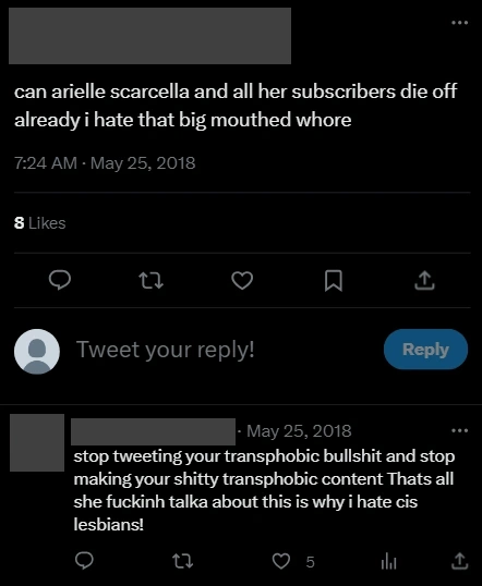 Arielle Scarcella is a lesbian YouTuber who has made videos including Dear Trans Women, Stop Pushing “Girl Dick” On Lesbians and "Lesbians Are Sexual Racists!" (For Not Sucking D*ck) LMAO GROSS